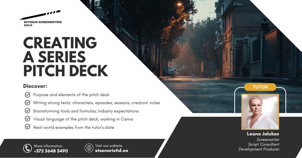 Eesti Stsenaristide Gild korraldab seriaali pitch deck’i koostamise koolituse "Creating a Series Pitch Deck", mis toimub kolmapäeval, 28. jaanuaril 2026 kell 18:00–21:00 Zoomis (keel: inglise keel).